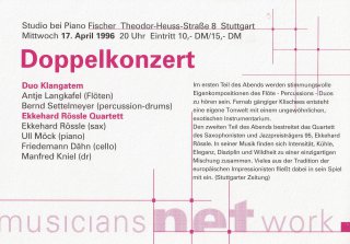 Den zweiten Teil des Abends bestreitet das Quartett des Saxophonisten und Jazzpreisträgers 95, Ekkehard Rössle. In seiner Musik finden sich Intensität, Kühle, Eleganz, Disziplin und Wildheit zu einer einzigartigen Mischung zusammen. Vieles aus der Tradition der europäischen Impressionisten fließt dabei in sein Spiel mit ein. (Stuttgarter Zeitung)