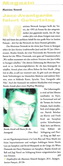 Mal und bietet den perfekten Arlaß für eine große Feier im lnstitut Franqais - dort hat das Netzwerk ein festes Domizil gefunden. Das Musicians Network ist der dritte Jazz-Yerein in Sruttgarr neben der Jazz-Society (traditioneller Jazz und der IG Jazz (Mainstream). Branko Arnsek, der erste Vorsitzende des Netzwerks und Bassist bei den White Diamonds, setzr ganz auf Zusarnmenarbeit: