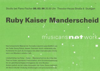 Unüberhörbar bei Ruby - Kaiser Manderscheid ist die Liebe des Trios zur freien, spontanen Improvisation, eine Grundvoraussetzung für ein gleichberechtigtes Interagieren der drei Musiker.